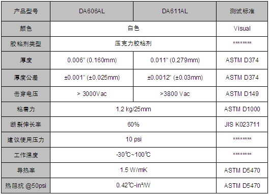 DA600AL系列導熱雙面膠大量應用于粘接散熱片到微處理器和其它功率消耗半導體上,這些膠帶具有極強的粘合強度,并且熱阻抗小,可以有效的取代滑脂和機械固定。
